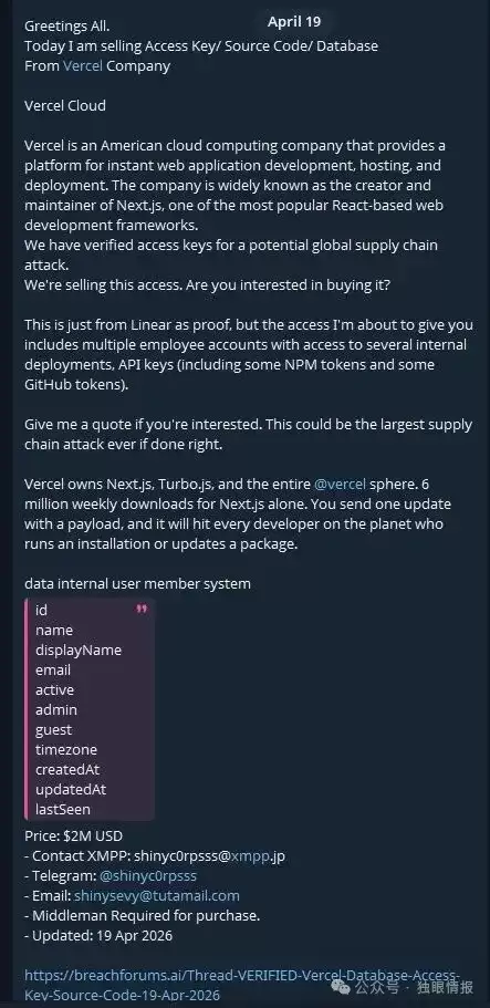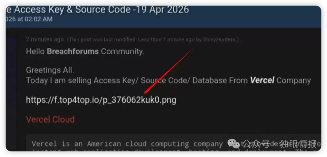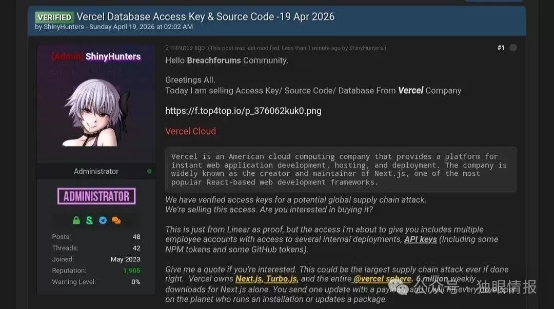 长话短说 先说一个核心判断:在breachforums[ ]ai上署名ShinyHunters的卖家,几乎可以判定为冒名顶替者,而非真正的ShinyHunters组织。这个判断的置信度相当高。 事情要从2026年4月19日说起。当天,Vercel发布了一份极其简短的安全通告,确认其“部分内部系统”遭