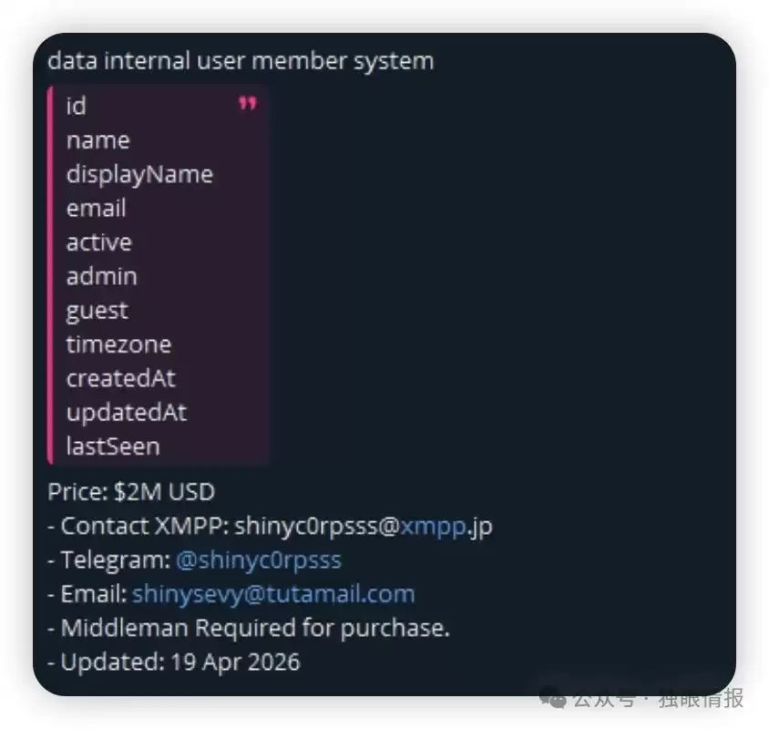 首先看账号命名的“仿冒指纹”:真正的ShinyHunters领袖在Telegram的已知别名是shinyc0rp(已被封禁),而帖子中提供的XMPP与Telegram账号却是shinyc0rpsss——在真账号尾部叠加上三个“s”,这是典型的冒名命名手法。至于邮箱shinysevy@tutamail.com则更加刻意,它粗暴地将领袖名和一个下线成员名“Sevy”缝合在了一起。
