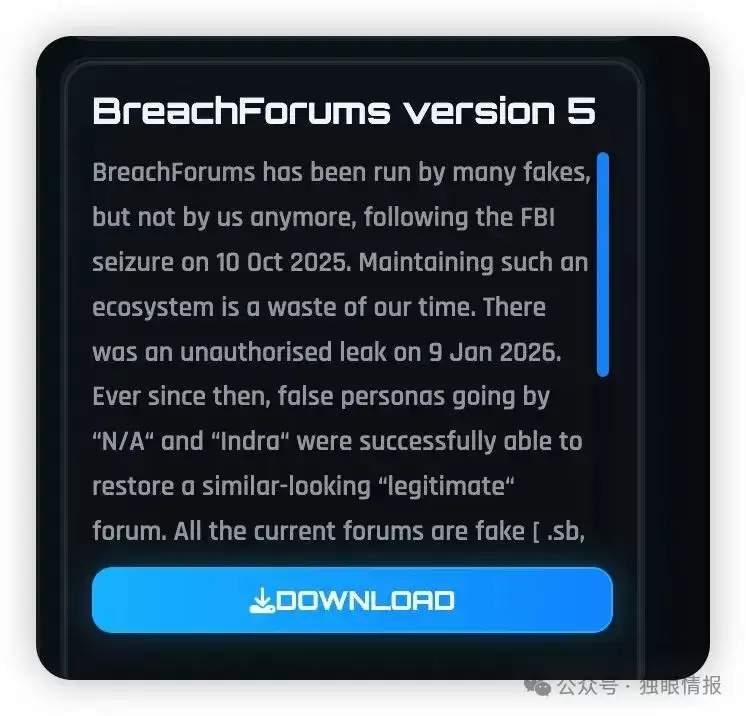 其次,论坛本身已被行业钉上“反诈”标签。SpyCloud Labs在4月10日的月报中明确研判,breachforums[.]ai是一个骗局镜像站。而真正的ShinyHunters组织早在3月26日的DLS声明中就公开宣布,自2025年10月FBI查扣原站后,所有BreachForums镜像站均为假冒,并威胁要泄露完整备份来打掉这些仿冒站。一个真正的组织,绝无可能在自己公开宣称为假、并准备摧毁的论坛上,顶着[Admin]标签做生意。
