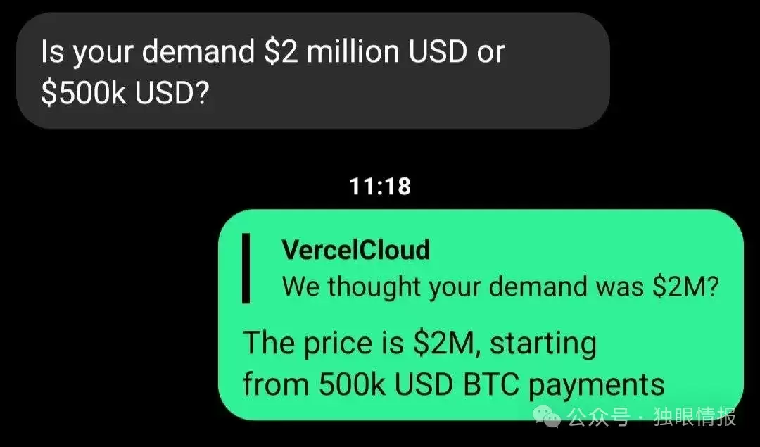 - 第二段(议价):Vercel方问:“Is your demand 500k USD?”,发帖者回复:“We thought your demand was”,随即补救为“2M, starting from 500k USD BTC payments”。