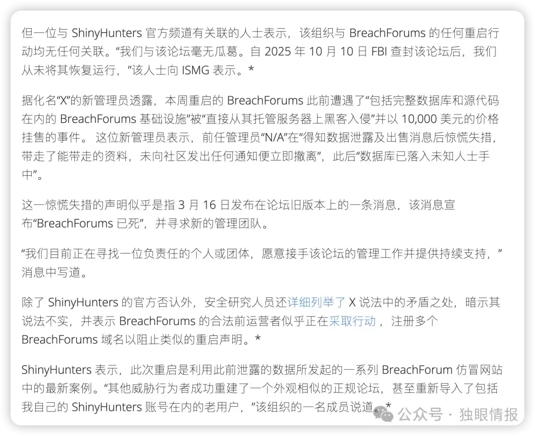 最后,这次冒名存在一个清晰的时间窗口和模仿脚本。早在4月初,ISMG就报道过一次完整的冒名演练——某个“X”在另一个BreachForums镜像站借ShinyHunters品牌重启论坛,挂上该组织历史受害者清单以制造规模感,随即被真组织在当日否认。这次针对Vercel的版本,不过是同一个脚本的第二次上演。