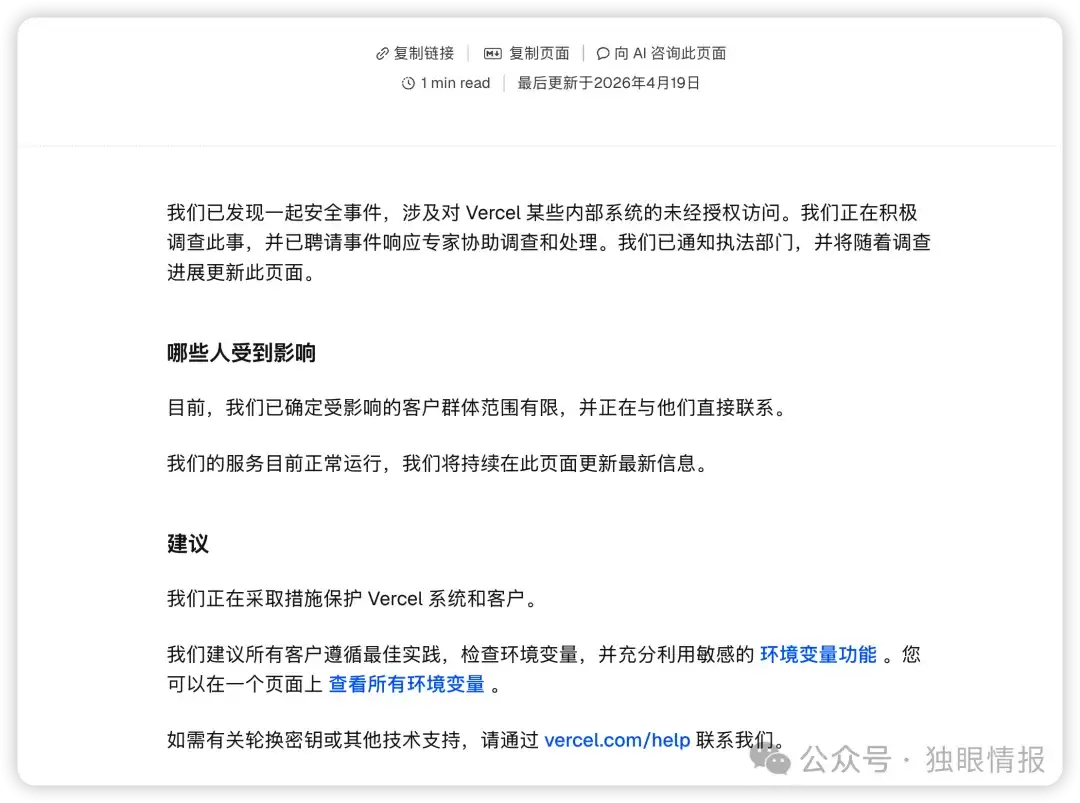 Vercel在4月19日于知识库发布的安全公告,信息密度极低但要素齐全:承认“未授权访问某些内部Vercel系统”;确认“已识别有限范围的受影响客户并正在直接沟通”;声明“已通知执法机构”、“已聘请事件响应专家”;建议所有客户“检查环境变量并利用敏感环境变量功能”。