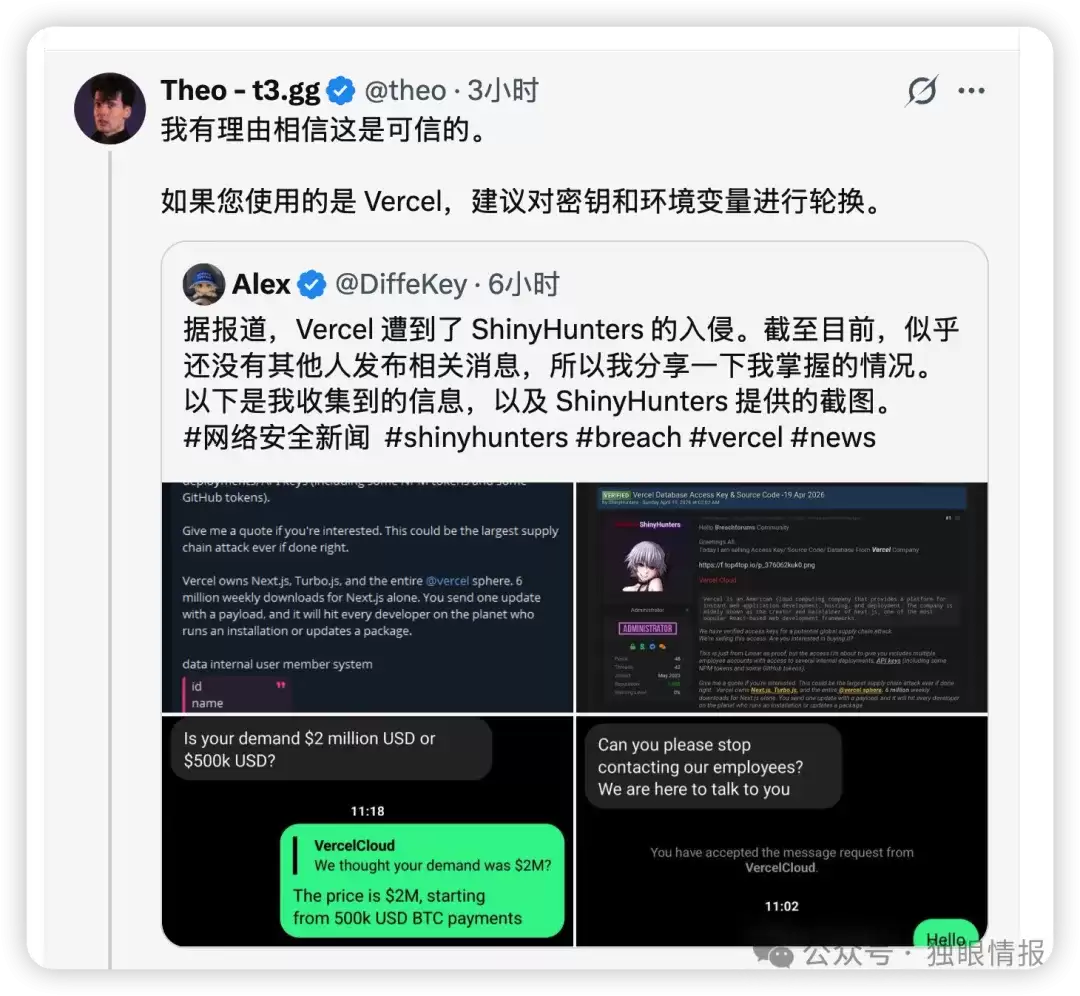 但必须警惕的是:判定卖家为冒牌货,绝不等于Vercel没有遭遇入侵。Vercel于4月19日发布的最新公告是一个独立的P0级事实;其主动联系叫卖者的行为,反向证实内部确实出现了情况;而圈内人士Theo(t3.gg)在X上的口径也指向Linear和GitHub是主要被命中的内部系统。因此,更合理的研判是:真正的入侵可能确实发生过,但把入侵产物拿到BreachForums挂牌的这个人,大概率是从中间环节顺手拿到一部分素材的二道贩子或冒名者,而非原始的入侵者。这个判断的置信度为中等偏高。