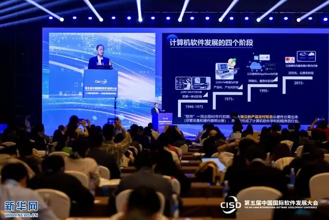 中国科学院院士、北京大学计算机学院教授梅宏在第五届中国国际软件发展大会上发言。新华网发