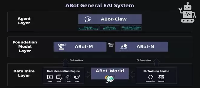 那么,途途为何能在开放世界中做到全自主行动?答案在于其感知和理解世界的方式发生了质变。据了解,高德已构建起全球首个面向AGI(通用人工智能)的全栈具身技术体系——ABot体系。该体系分为三层:DATA层(数据层)、MODEL层(模型层)和AGENT层(应用层)。
