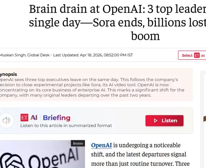 【环球网科技综合报道】4月19日消息,据《经济时报》报道,OpenAI正经历一场引人注目的战略转向。近日,公司三位高级管理层——凯文·韦尔、比尔·皮布尔斯、斯里尼瓦斯·纳拉亚南在同一天宣布离职,恰逢公司关停多项实验性项目,这一系列动作无疑将行业的目光再次聚焦于这家AI巨头的未来航向。值得注意的是,这股离职潮并非孤立事件,它延续了过去两年的趋势。一个更具象征意义的数字是:OpenAI最初的11位联合创始人,如今仅剩山姆·奥特曼和格雷格·布罗克曼两人仍在公司。