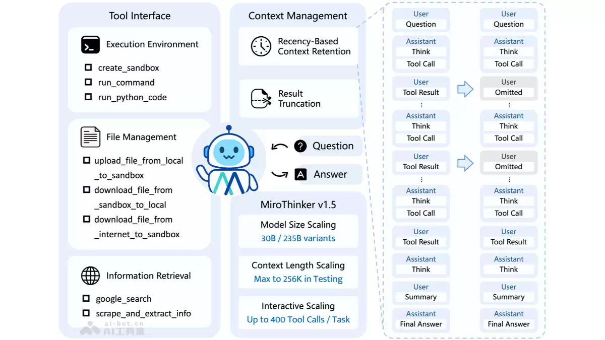 - 轻量级设计:MiroThinker v1.5有意控制了模型的参数规模,不盲目追求“大”。它将宝贵的算力更多地倾斜于外部信息的获取与交互本身。正是通过这套交互式推理机制,它用小体量实现了大功能,显著提升了智能密度。