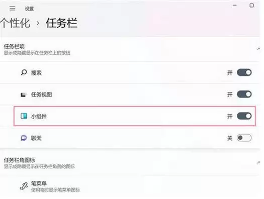 2、进入设置窗口后,在左侧列表中选择【个性化】,接着点击右侧的【任务栏】选项。在这里,你会看到一个【小组件】的开关,把它关闭即可。这样一来,无论你怎么按键盘上的W键,都不会再弹出那个小组件面板了。