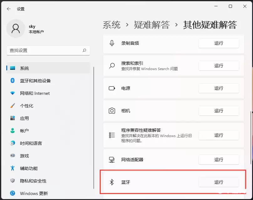 在一列可用的疑难解答程序中,找到 “蓝牙” 这一项。看到它之后,关键操作来了:点击旁边的 “运行” 按钮。