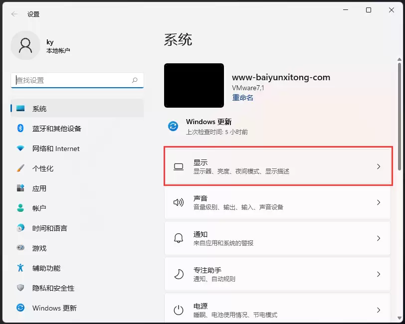 3. 进入设置窗口后,左侧菜单栏默认选中“系统”,右侧主区域则直接点击“显示”选项。