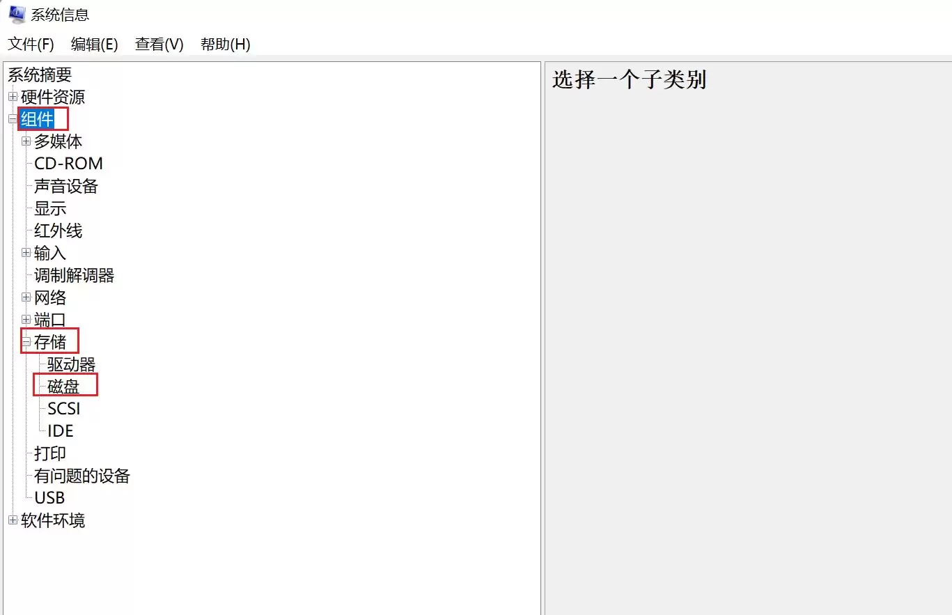 在系统信息窗口的左侧,你需要依次展开并点击【组件】->【存储】->【磁盘】。