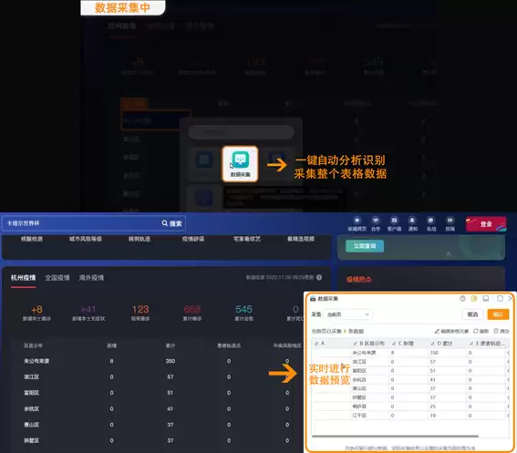 举个例子,假设需要采集抖音网页上关于“杭州疫情”的表格数据。用户只需点击表格内的任意位置,一次点击,即可完成整个表格的自动采集,并实时预览数据。这极大地提升了数据采集的稳定性和效率。