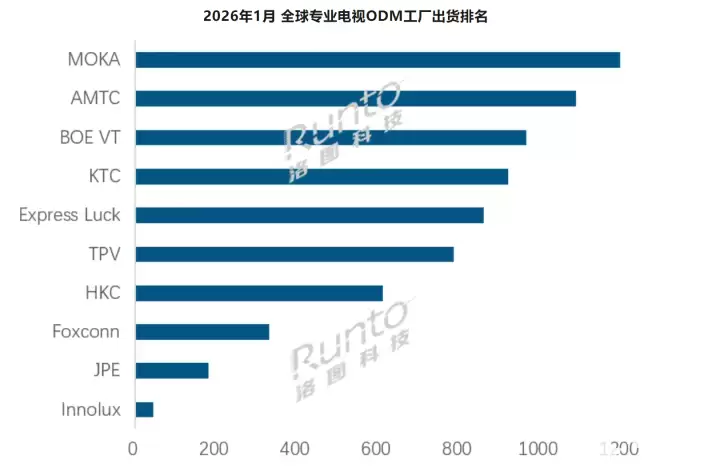 1月,Top10的专业ODM工厂的出货总量较去年同期增长12 5%,洛图科技表示,进入新年1月,在多重因素的影响下,电视整机的制造需求显著前置。 2月28号消息,根据洛图科技(RUNTO)最新数据显示,2026年1月,Top10的专业ODM工厂的出货总量较去年同期增长12 5%,不过,环比去年12月