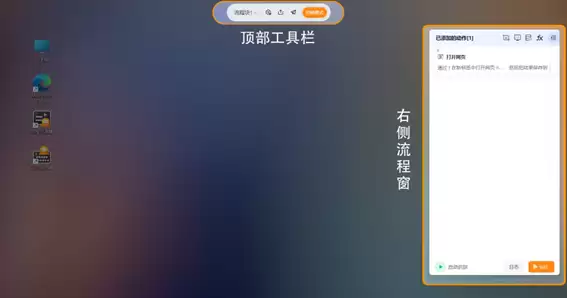 值得一提的是,无论是顶部工具栏还是右侧流程窗,都可以随时收起隐藏。这样一来,更大的屏幕空间就能完全交还给业务人员,实现沉浸式操作,彻底告别以往在RPA编辑器和业务软件间频繁切换的繁琐。此时,桌面上的任何一个可见元素,既是IPA识别和操作的对象,也成了配置自动化流程的天然画布。