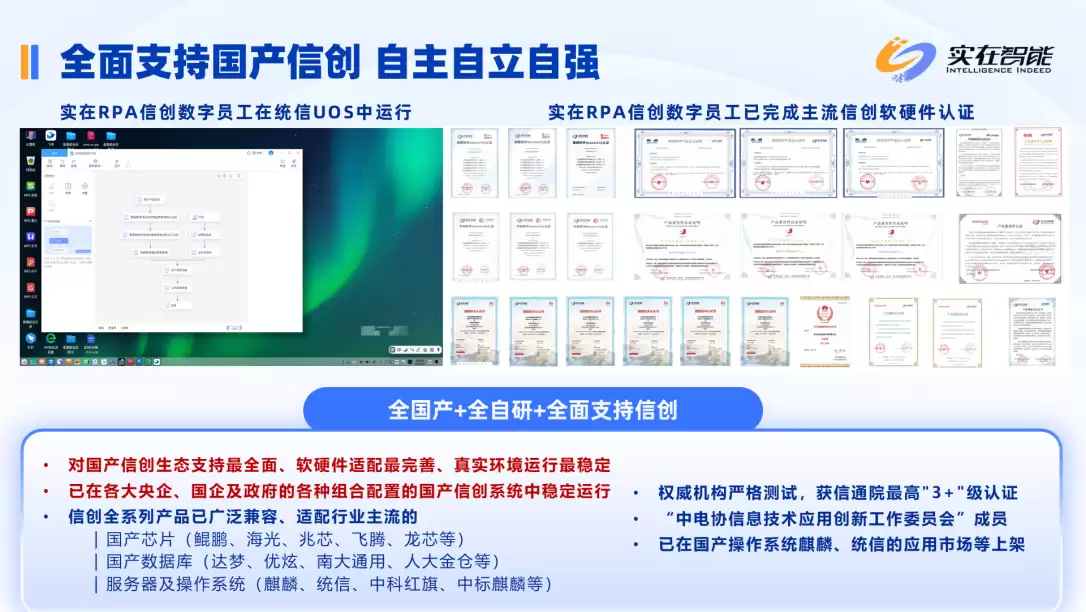 实在智能不仅是信创工委会成员,也是中国信通院RPA产业推进方阵的副理事长单位,深度参与了《机器人流程自动化能力评估方法》《智能文档处理》系列行业标准的制定工作。同时,它还是少数几家获得信通院RPA最高等级“3+”认证的厂商。其RPA数字员工,已在众多央企、国企及政府的各类国产信创系统中稳定运行了数百万小时。