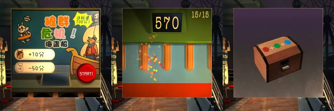 接下来,挑战“狼群危机”。这个游戏的核心目标是精准击打作恶的狼,打得越多分数越高。这里有个关键陷阱:千万别误打到兔子! 一旦打到,会直接倒扣50分,非常伤。按照这个思路,最终拿到570分就能顺利通关,奖励是一个上锁的宝箱。