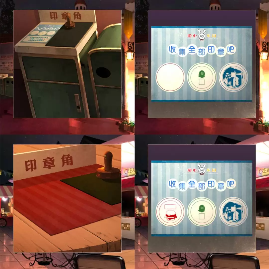 接着,走到大门附近的垃圾箱处盖第二个章。最后,前往餐饮区的桌子,那里有第三个印章角,完成盖章。