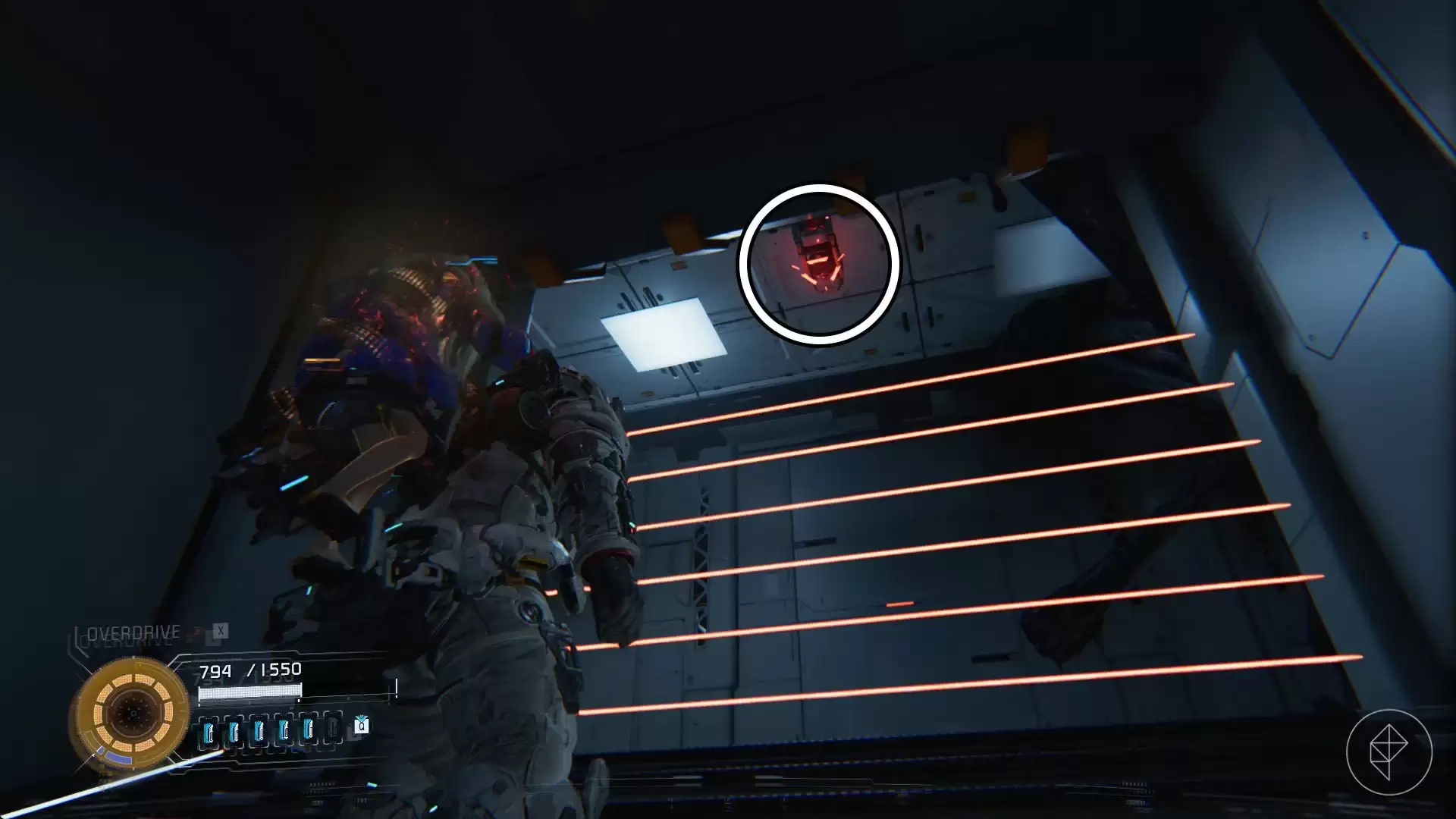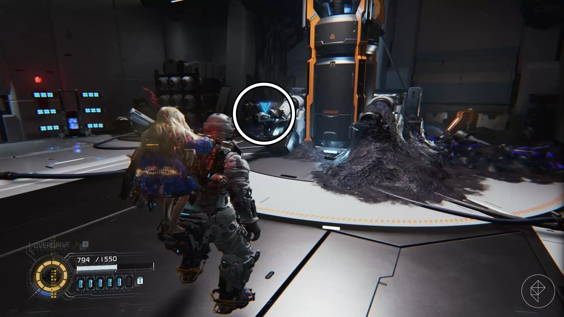 继续深入,进入下一个房间,最终抵达反应堆。当你拿到它时,四个步行者和一个枪骑兵会接连出现。击败所有敌人,然后将Diana带到下一个区域,触发过场动画。之后,把Diana放回桌子上,开始另一段动画。
