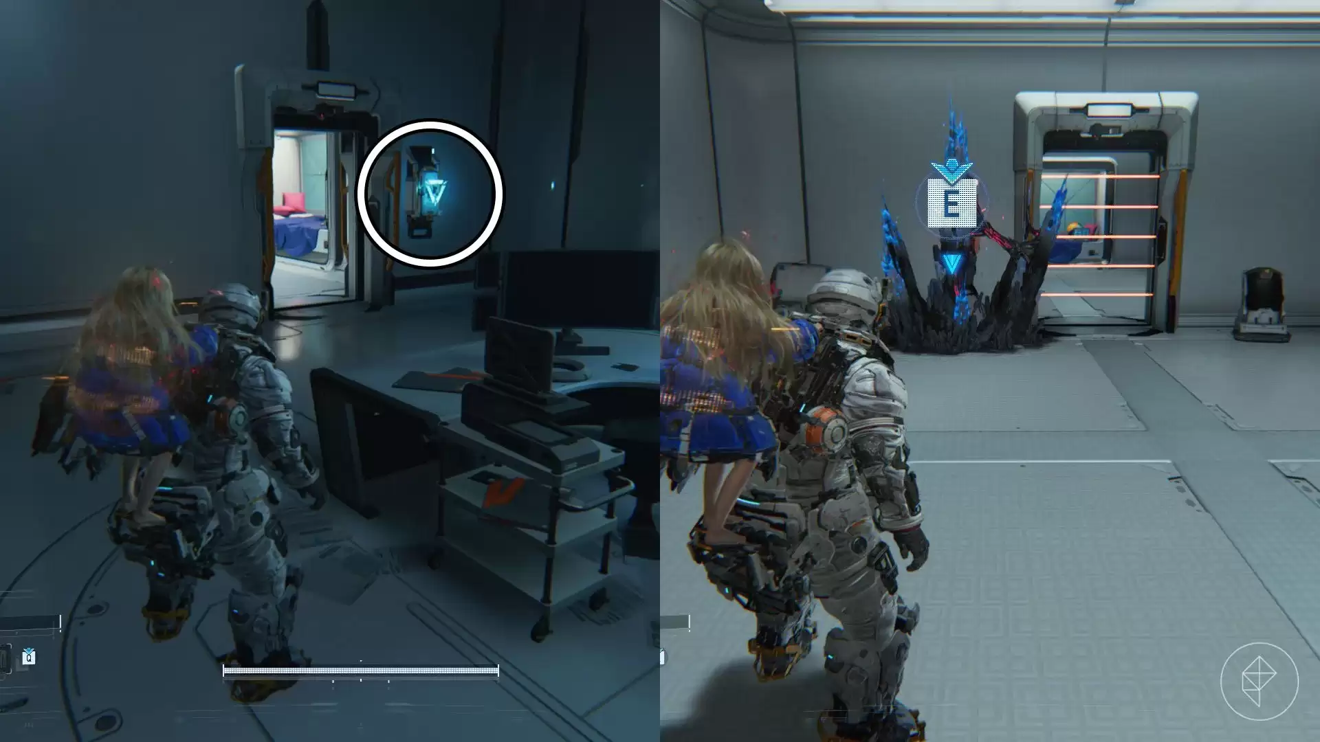 接下来,侵入墙上的终端,然后摧毁下一个房间里的丝状体。丝状体被清除后,会露出后面一个可侵入的终端。破解它,进入下一个房间,里面有几份文件可供收集。