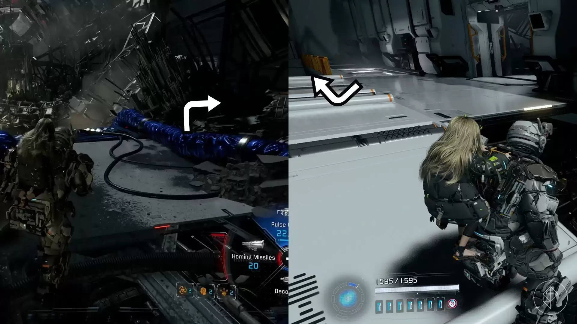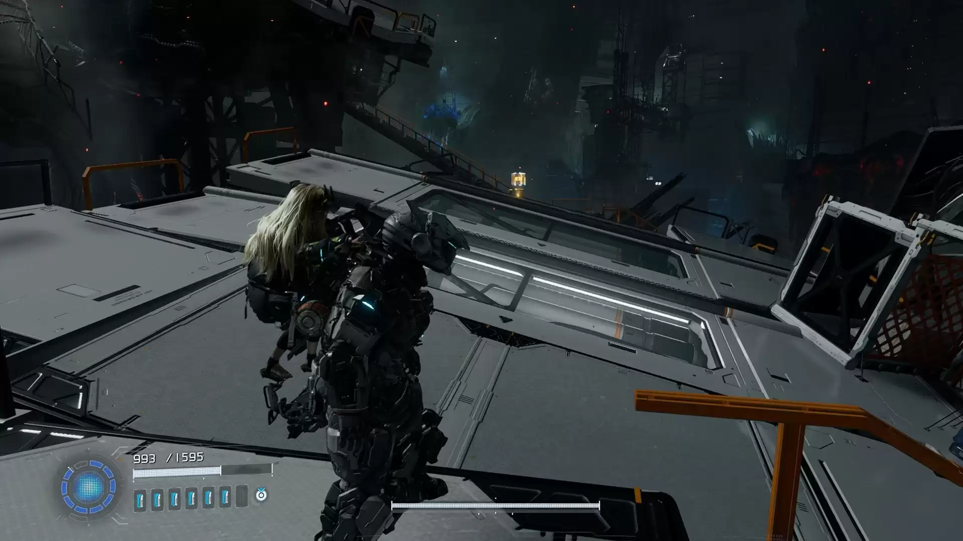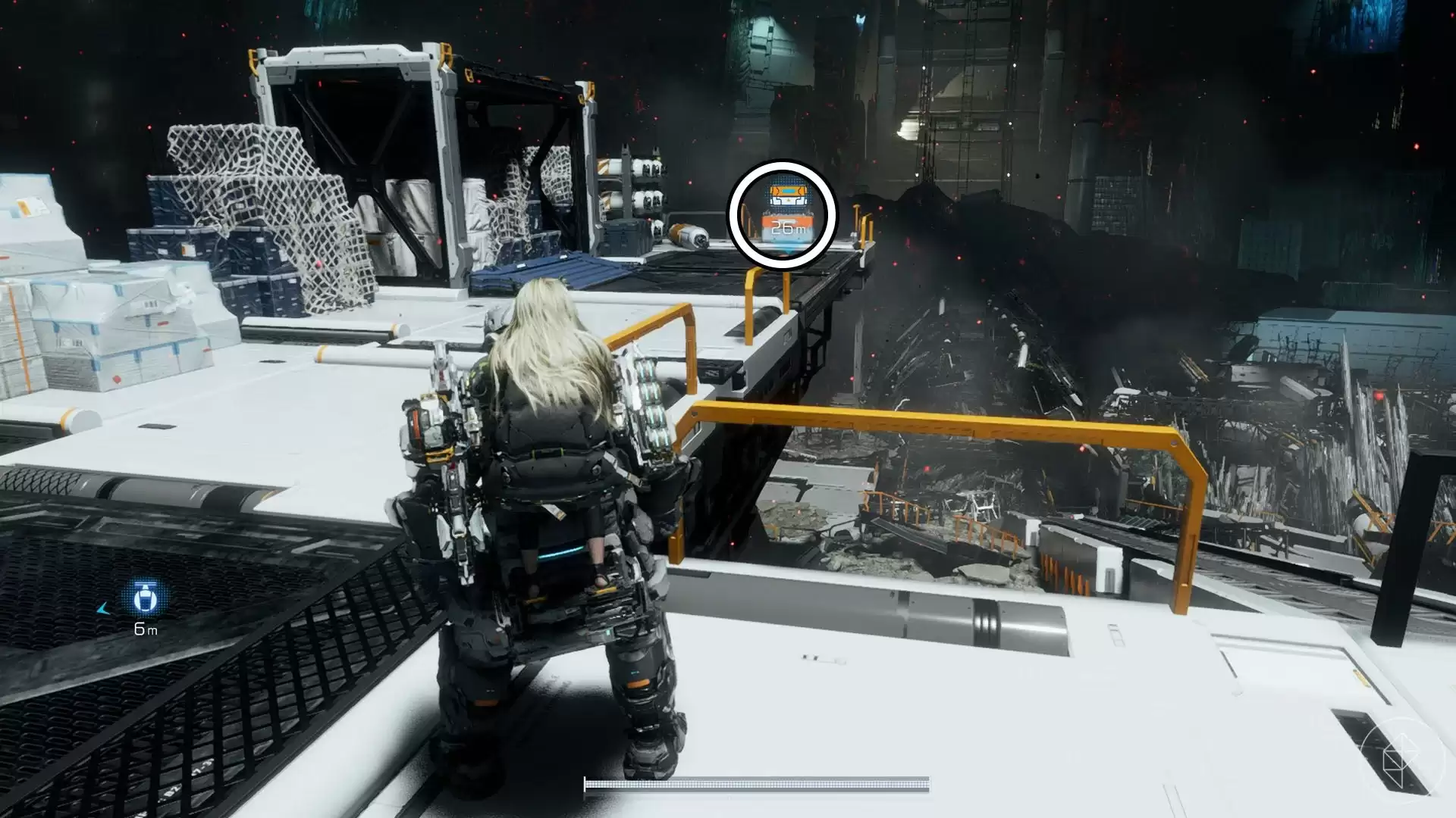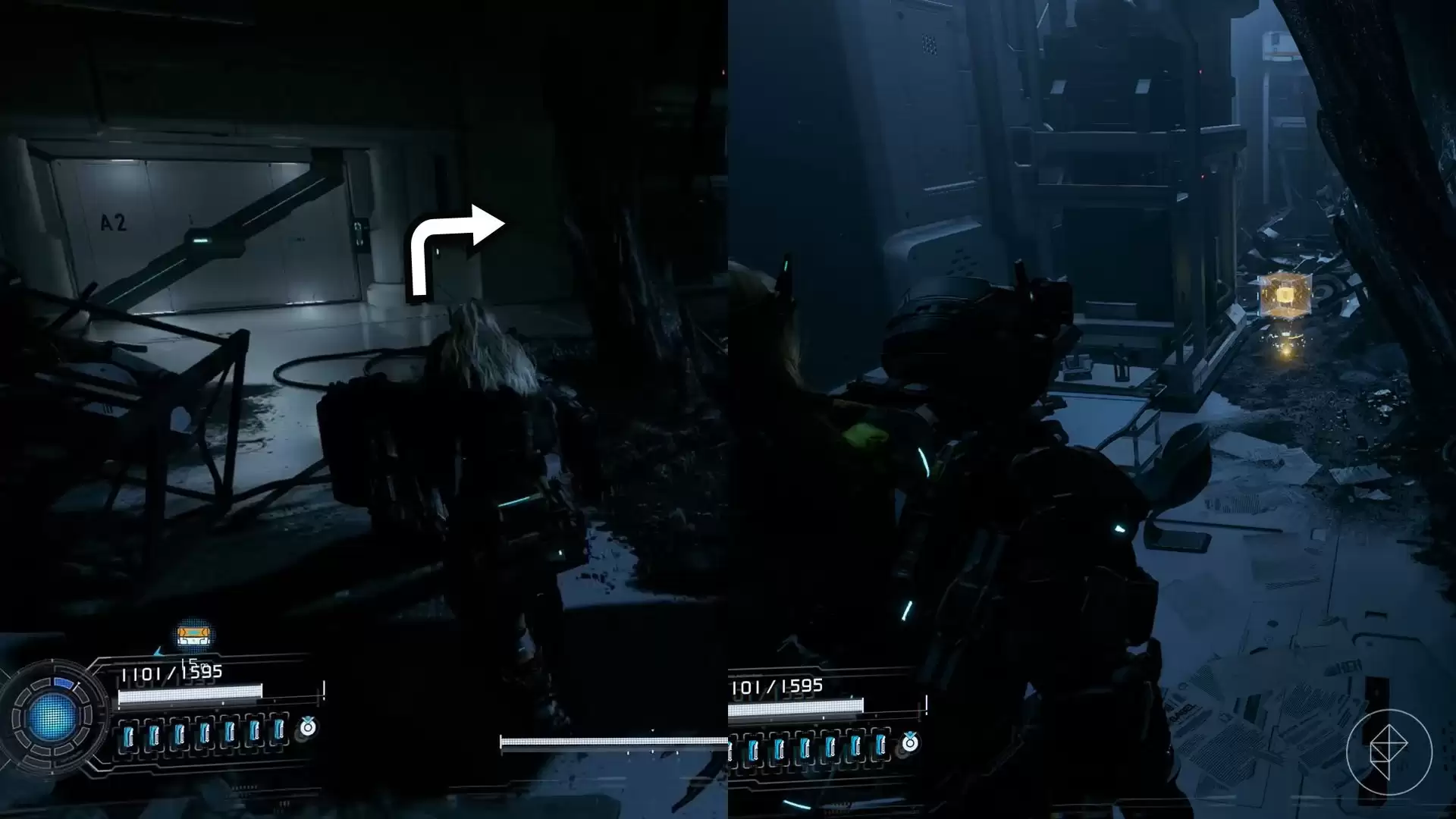 站在刚才找到组件的平台上,向右看。你会看到一个堆满残骸的平台,再往前一点,另一个平台上就放着这个组件。