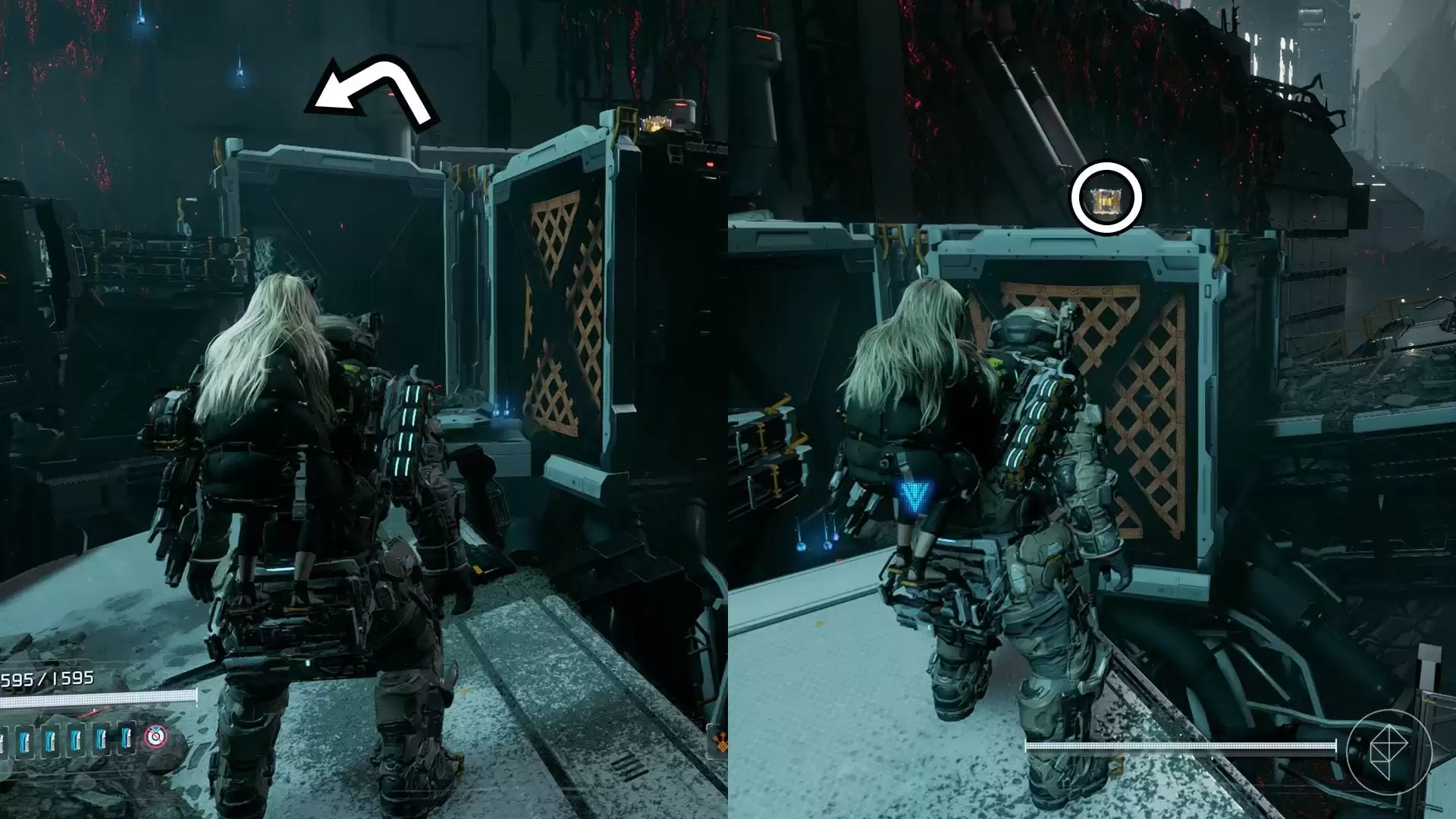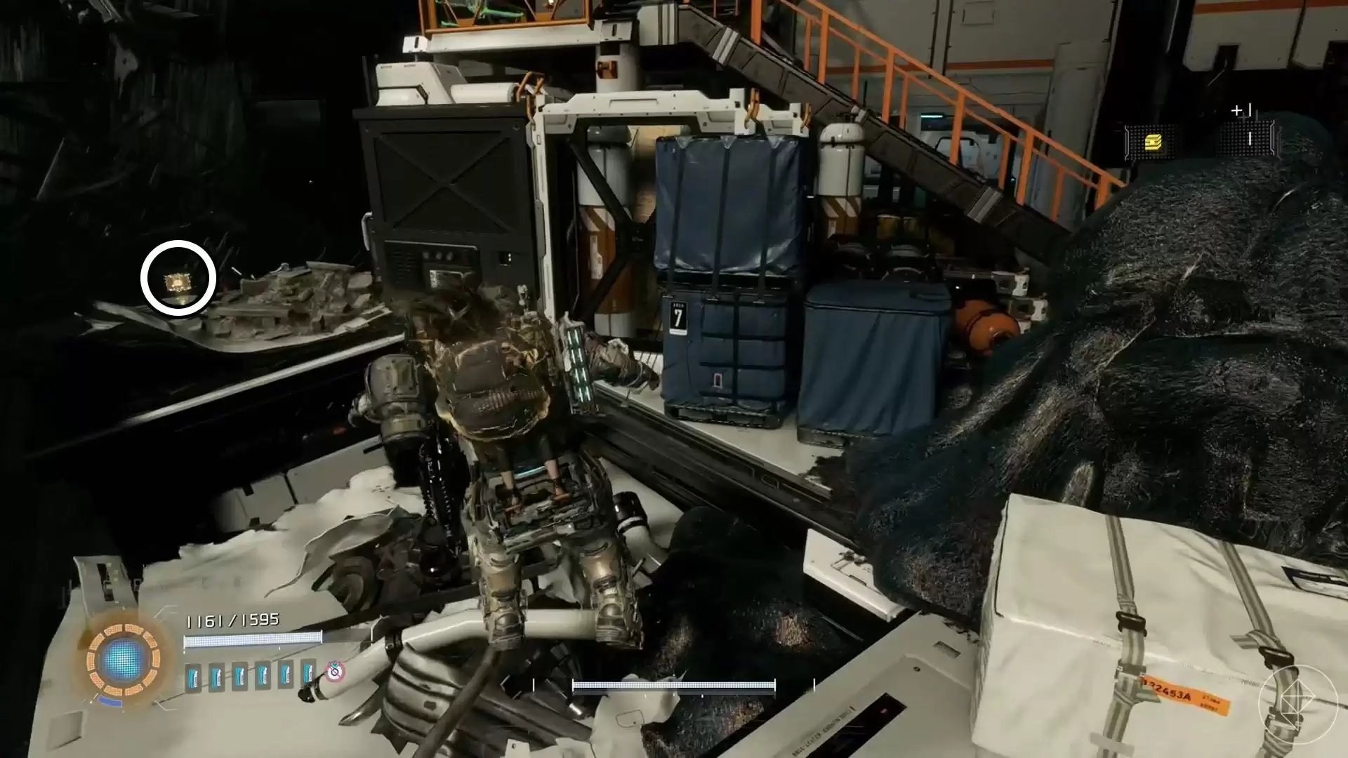 穿过研究区大门的舱门,你会走上一条沿着集装箱铺设的路径。仔细探索集装箱顶部,其中一个上面就藏着升级组件。