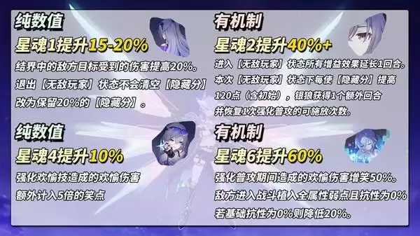 星魂1(数值提升): 伤害提升约15-20%。效果是在结界中为敌方附加20%易伤,并且在退出“无敌玩家”状态后,能保留20点隐藏分。