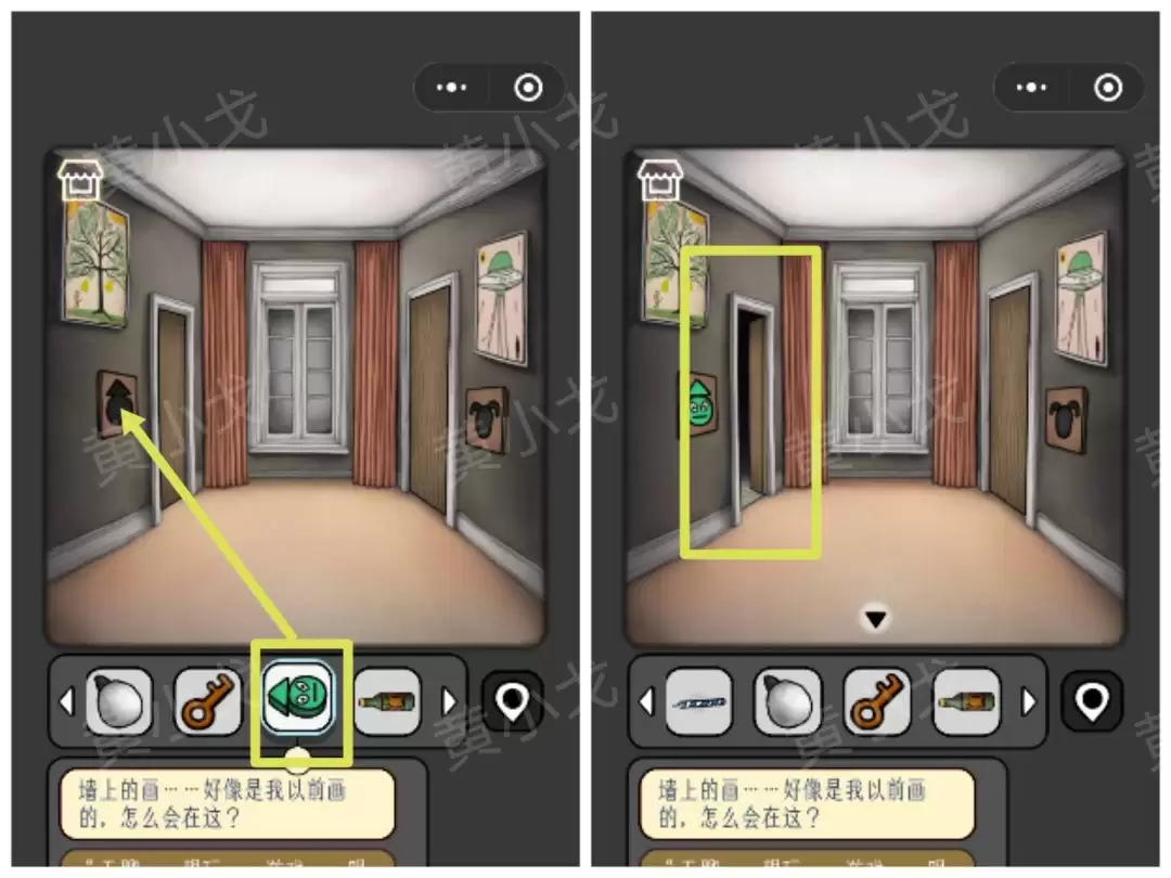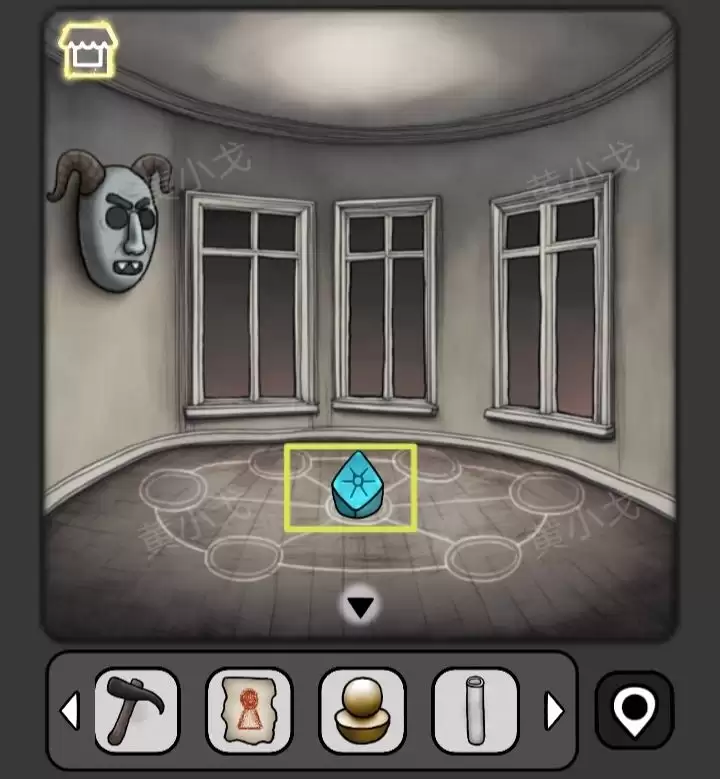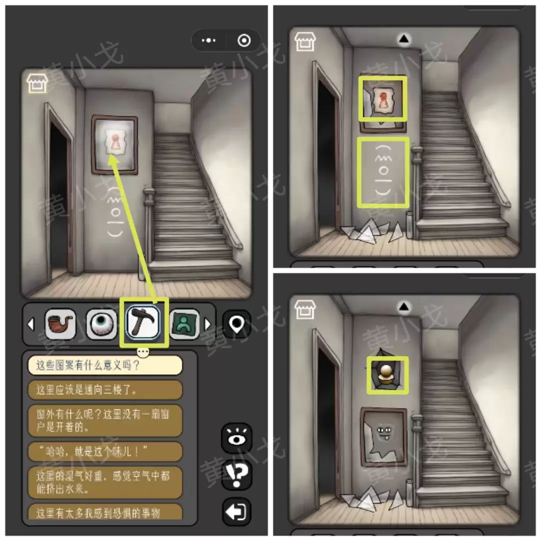 31. 用【锤子】砸开墙上的相框,得到【画纸】;同时,一个暗格弹开,里面是【符石】。注意:墙上有一组图案,务必看清记牢。