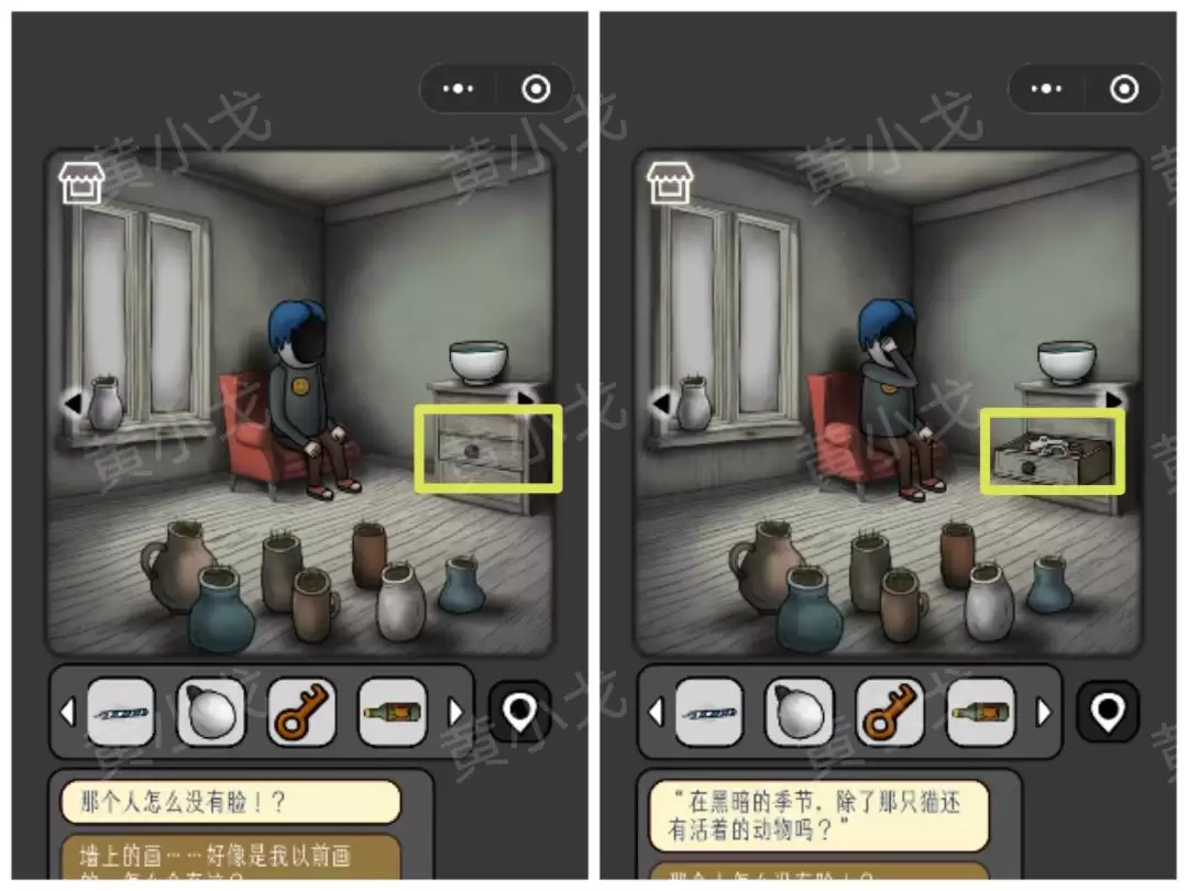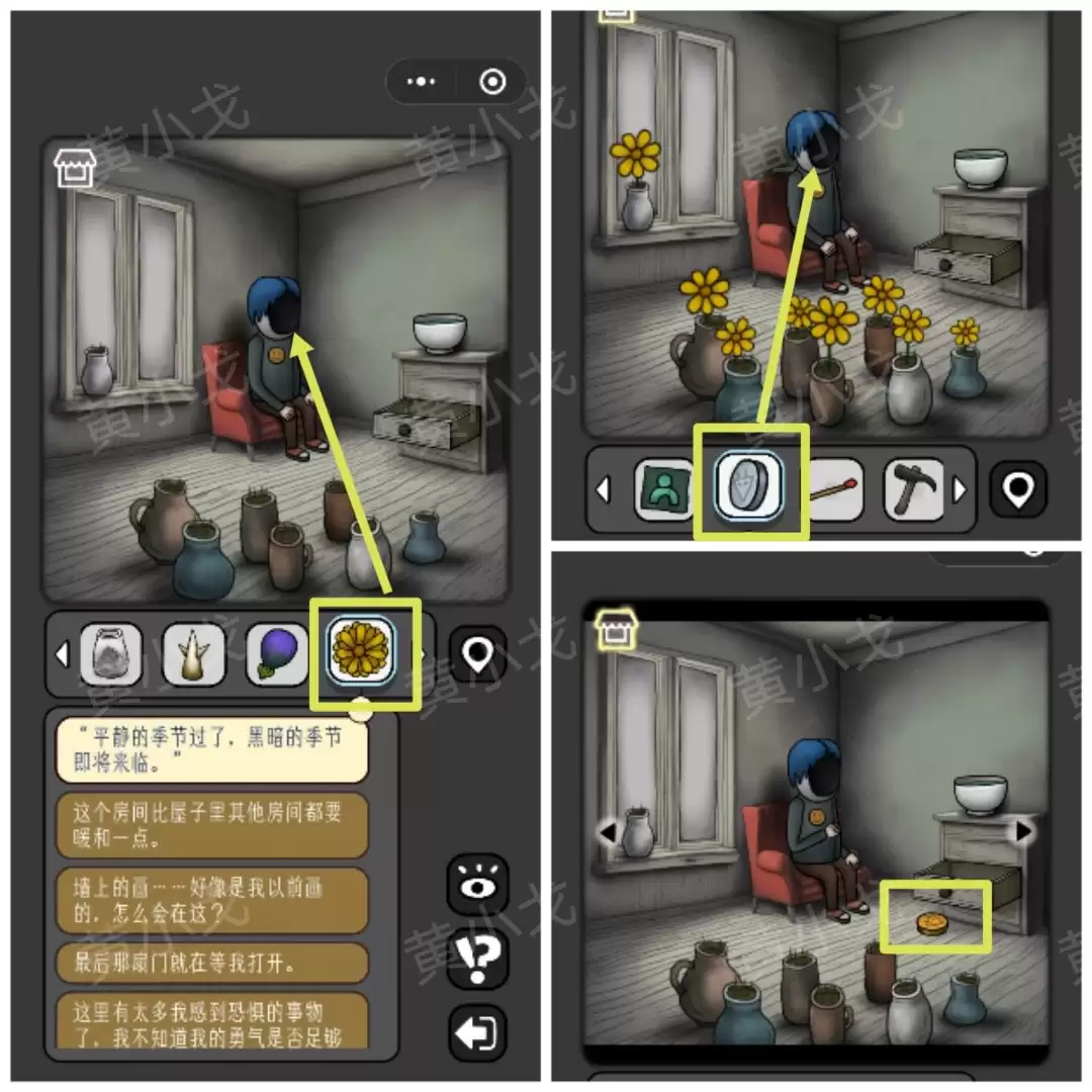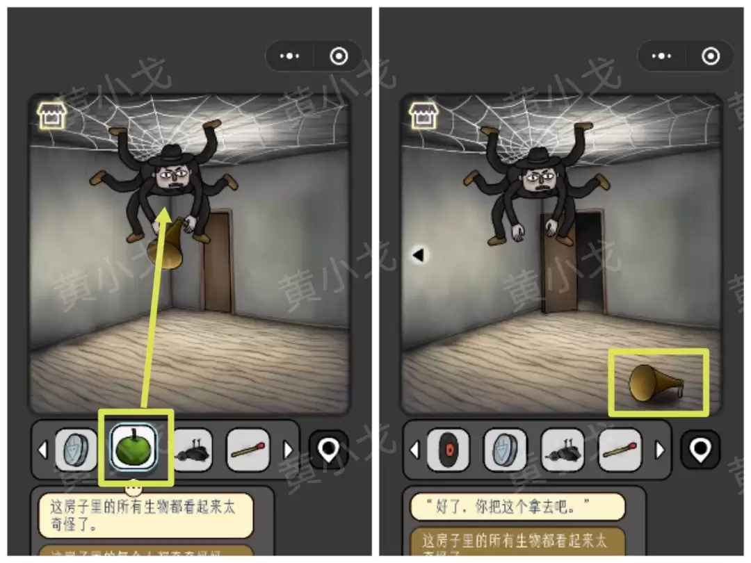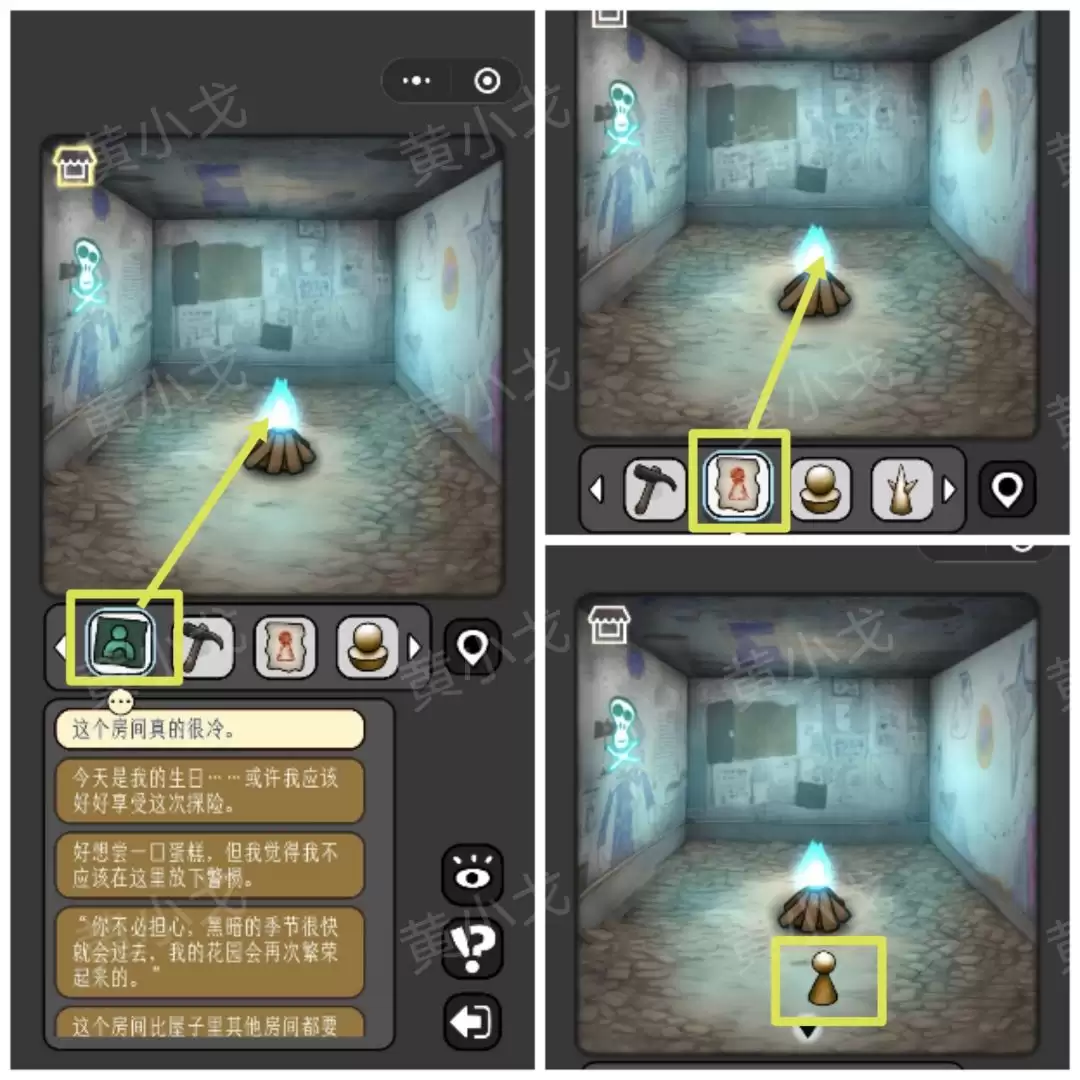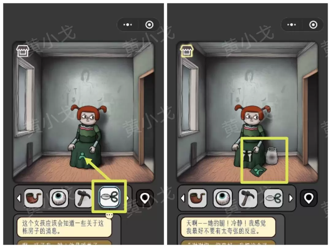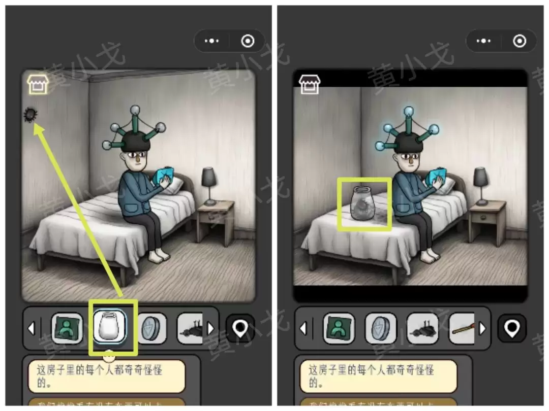 《宇宙怪谈》黑暗的礼物攻略: 黑暗的礼物关卡 准备好了吗?我们这就进入这个光怪陆离的房间。首先,把目光投向那个[小女孩]。 1 点击她旁边的窗台,顺利拿到第一件道具——一把【勺子】。 转身,遇见[眼睛人]。 2 别被他盯着,直接从窗沿上拾取那支【蜡烛】。 角落里飘着一位[幽灵人]。 3 从他附