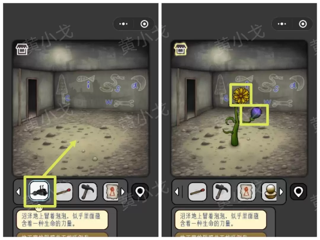 23. 将【鸟】扔进沼泽。奇迹发生,藤蔓生长,结出【果实】和【黄花】,记得拾取。