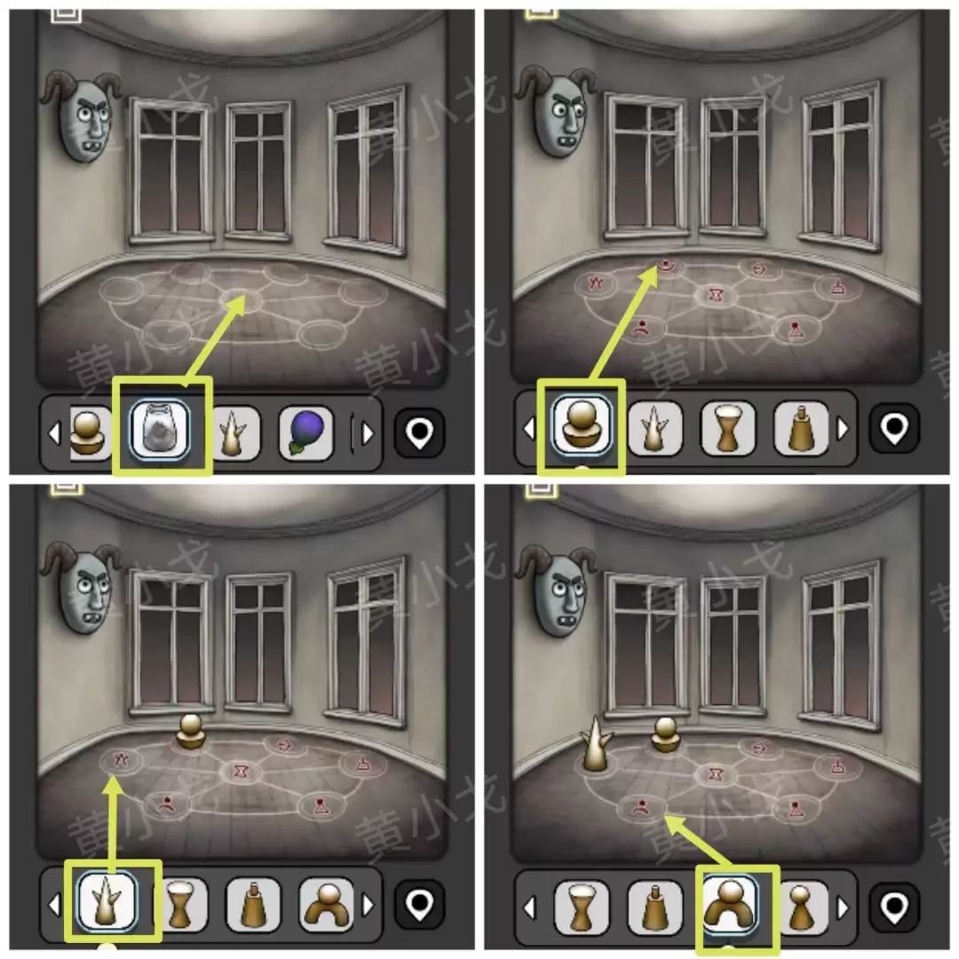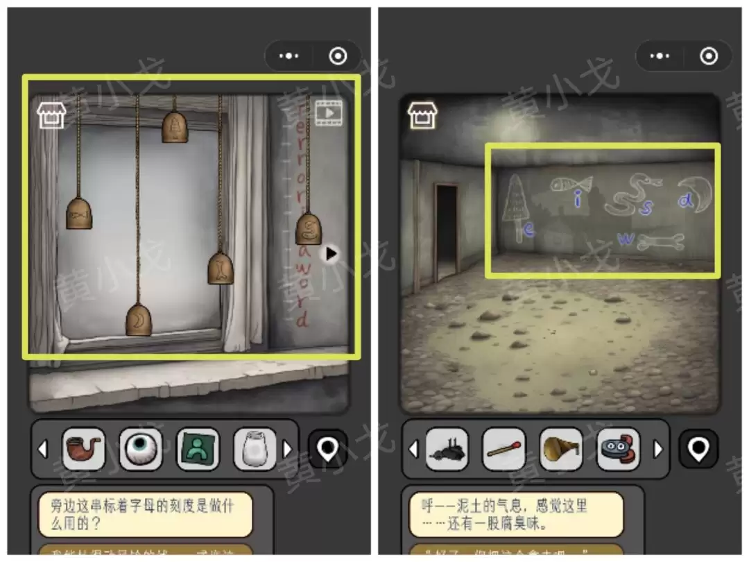 36. 点击窗台。这里需要用到在[沼泽]场景记下的图案和字母线索,调整窗台上对应图案风铃的位置。