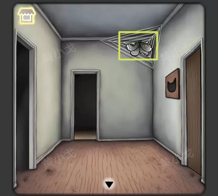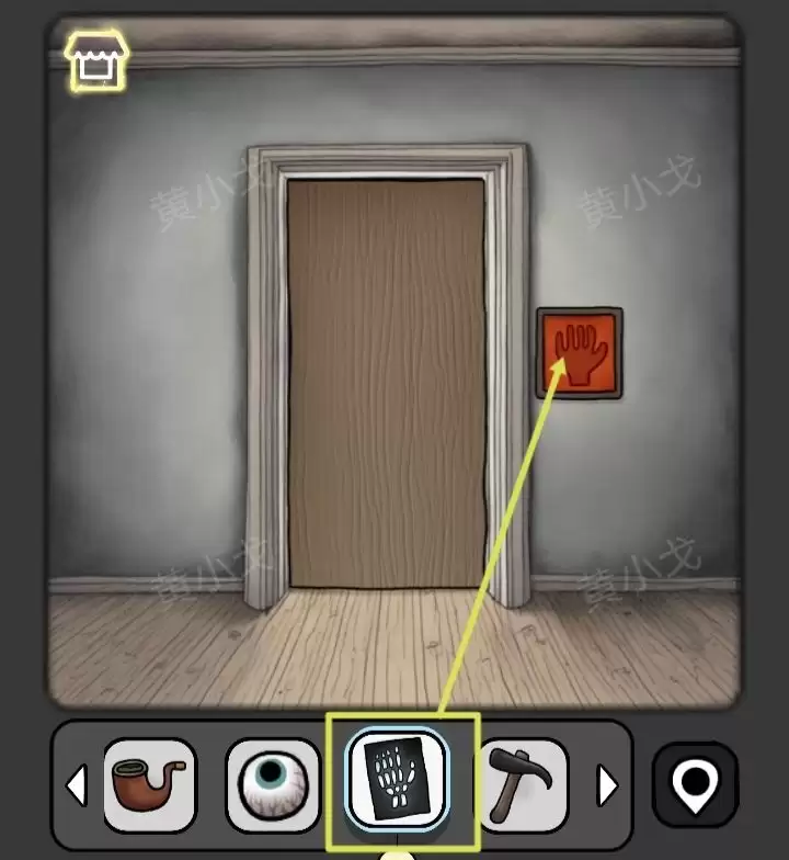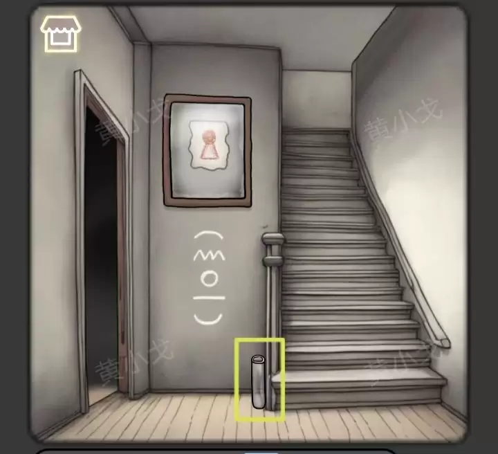 6. 走到门边,把刚才捡到的【按钮】安到门上的凹槽里。“咔哒”一声,门开了。
