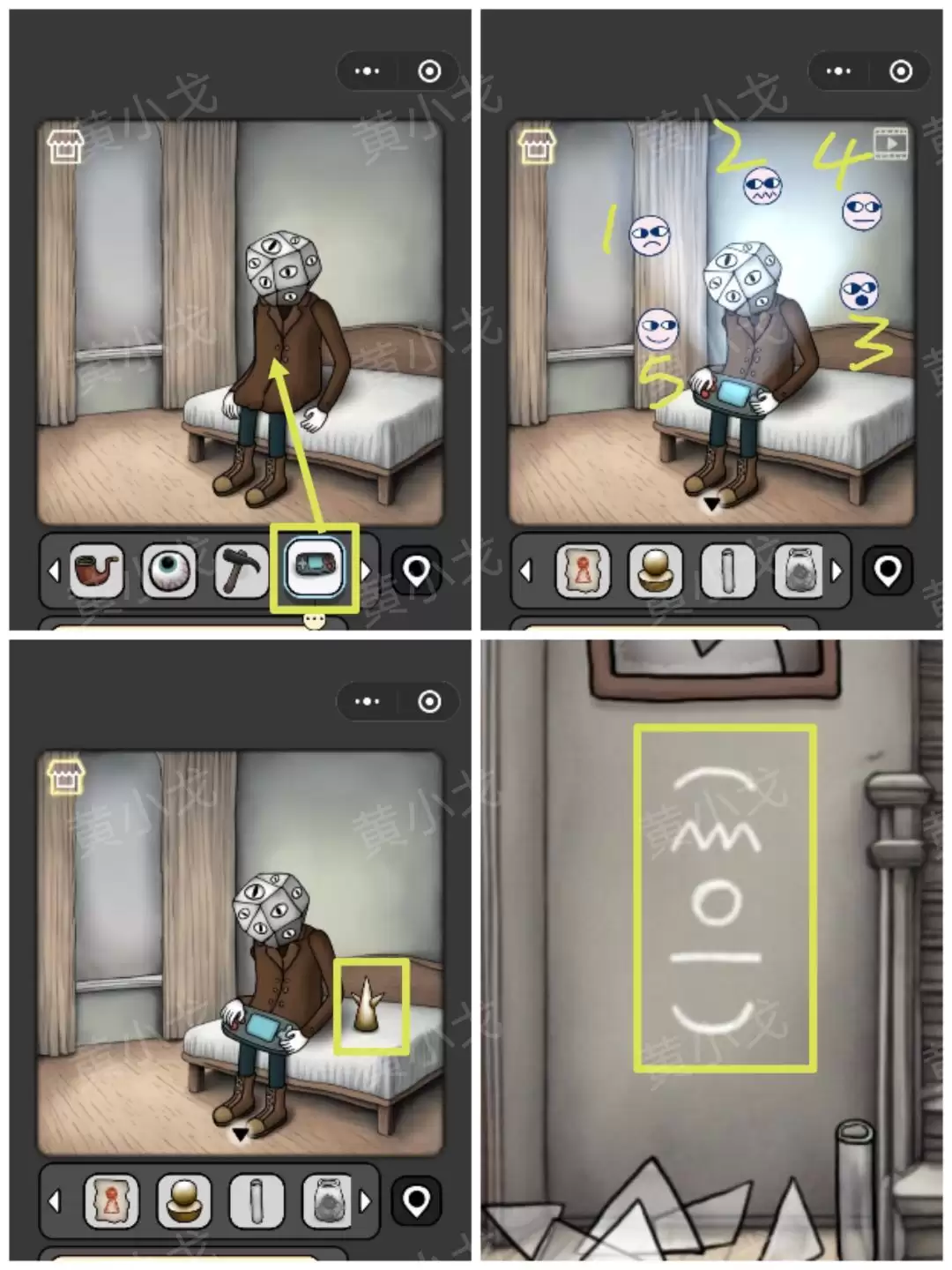 34. 把【游戏机】给他。这时,需要回想在[楼梯]场景墙上看到的图案顺序,按照那个顺序按下游戏机上的表情按钮。成功后,获得【符石】。