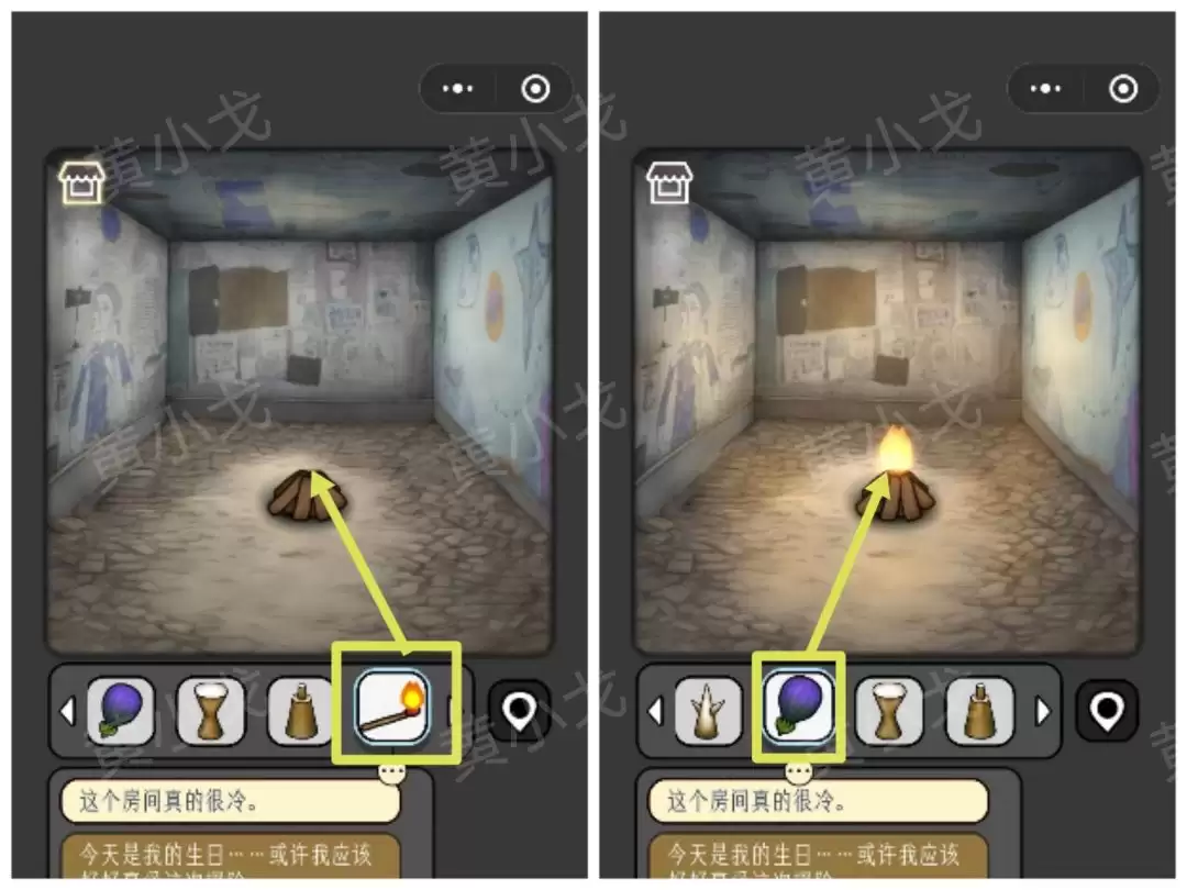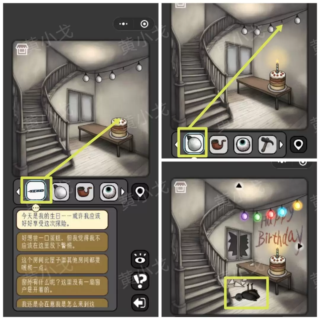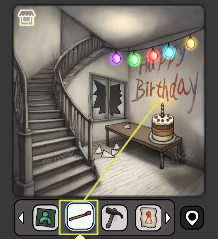 14. 将【蜡烛】插到蛋糕上,再把【灯泡】挂到彩灯串上。完成后,别忘了捡起地上那只【鸟】。