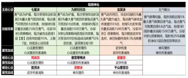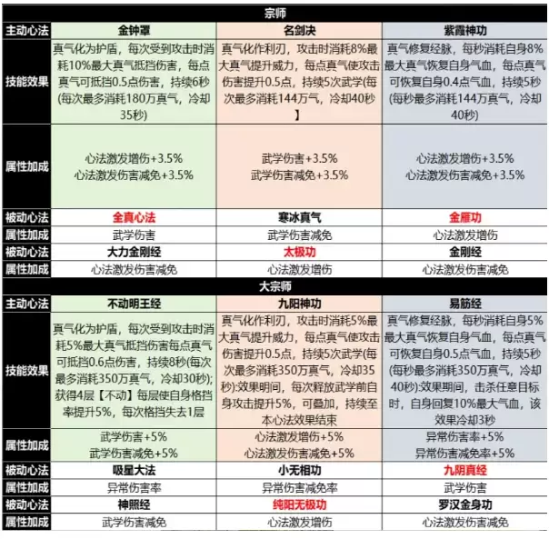 被动心法的选择思路则要明确得多:建议优先以输出为主。下面两张图涵盖了从宗师到陆地神仙的所有心法,其中标红色的被动心法均为增伤类心法修炼是无法重置的,因此一定要优先修炼那些对输出有直接帮助的心法。另外要分清修炼和突破的区别:主动心法的修炼只会增加基础属性,不影响输出数值;而心法突破才会直接影响技能的伤害效果。