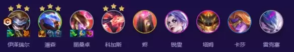 核心英雄包括:EZ、潘森、丽桑卓、科加斯、烬、锐雯、塔姆、卡莎、雷克塞。
