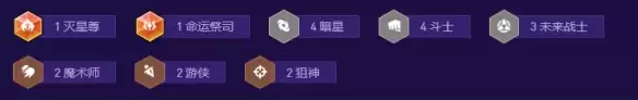 成型后的羁绊效果为:1灭星尊、1命运祭司、4暗星、4斗士、3未来战士、2魔术师、2游侠、2狙神。这套羁绊组合兼顾了前排坦度、后排输出以及功能加成,体系相对完整。