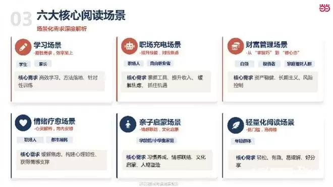 对应这四大核心人群,具体的阅读行为又落到了六大生活场景之中,覆盖学习、职场、生活、情感等多个维度,场景化、多元化的特征非常明显。