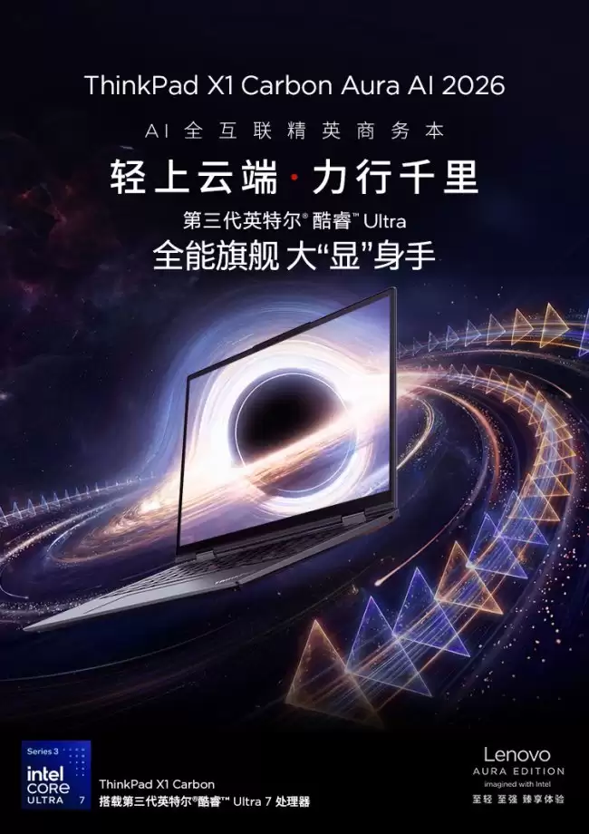 4月22日,联想发布多款AI PC新品,ThinkPad X1 Carbon Aura AI 2026成焦点 4月22日,联想面向商务用户发布了一系列搭载第三代英特尔酷睿Ultra处理器的AI PC新品。其中,全新亮相的ThinkPad X1 Carbon Aura AI 2026 “AI全互联精英