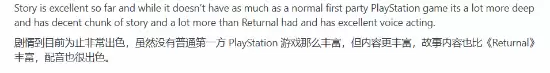 除了玩法,剧情和演出也是早期体验的亮点。该玩家表示,目前体验到的剧情内容相当出色。虽然整体体量可能无法与一些索尼第一方叙事大作相比,但相比《死亡回归》已丰富不少。游戏的配音水准尤其出彩,成功营造出了沉浸感十足的氛围。