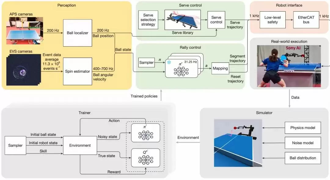 针对这些严苛要求,研究团队为Ace精心设计了三大核心模块:“高速感知系统”、“基于强化学习的控制系统”以及“高动态响应的机械臂硬件”。三者协同,才铸就了球台旁的这位AI球手。