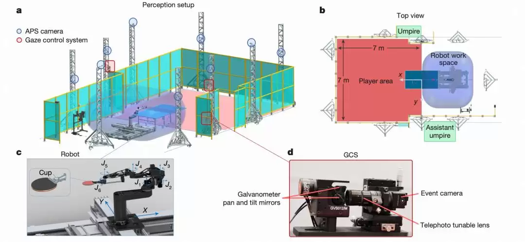图|Ace系统。其中,感知系统通过普通摄像头定位球的位置,并借助3套注视控制系统估算球的旋转速率;这些信息被基于AI的控制系统利用,指导比赛中的发球与回球;控制系统的决策则由1个配备8个独立控制关节的机械臂完成。
