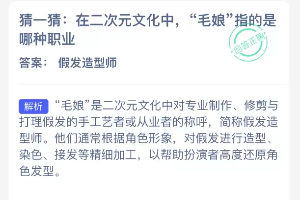 猜一猜:在二次元文化中,“毛娘”指的是哪种职业? 今天这道题挺有意思的,咱们来聊聊二次元圈里的一个专业行当。在蚂蚁新村2026年4月22日的每日一题里,题目是:“猜一猜:在二次元文化中,‘毛娘’指的是哪种职业?” 答案是:【假发造型师】。每天来答题,不仅能攒点木兰币,给咱们的小镇建设添把力,还能领到