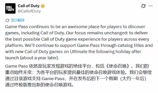针对这一策略变化,《使命召唤》官方账号随后发文进行了确认,明确了“延后一年入库”的消息。其声明强调:“我们的核心目标始终如一:为所有平台的玩家提供最出色的《使命召唤》体验。我们将继续通过作品阵容支持Game Pass,并确保新作在发售约一年后的假日季,登陆Game Pass Ultimate档位。”