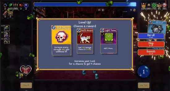 《吸血鬼幸存者》10分钟1亿金币高效刷法:地图选择「佛斯卡里湖」。核心武器仅保留「烟花」与「彪悍猫」(猫猫),卡牌携带顺序如图所示。开局后优先拿取「怪物刷新速度提升」Buff,其余