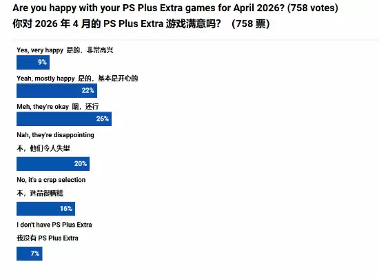 玩家群体对于此次月度游戏更新反响如何?海外知名游戏媒体pushsquare近期发起了一项专项投票,旨在收集玩家对本月PS Plus会免游戏阵容的真实评价。调查共吸引了超过758名活跃玩家参与,其结果分布呈现出多元化的态度。数据显示,对阵容感到“基本满意”的玩家占比22%,认为“非常满意”的占9%,另有26%的玩家持“认可”态度。另一方面,对本次更新感到“失望”的玩家比例为20%,同时有16%的参与者直言阵容“非常糟糕”。