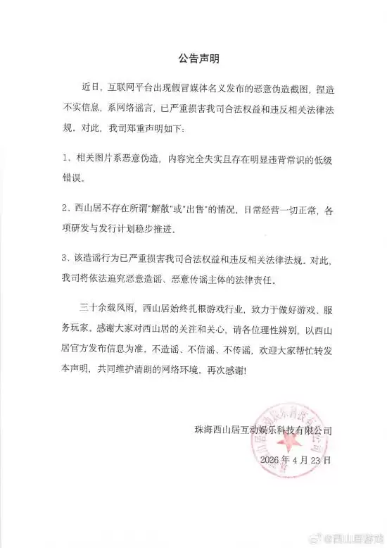 对于这种严重损害公司合法权益、违反法律法规的造谣行为,西山居表示将依法追究恶意造谣、传谣主体的法律责任。