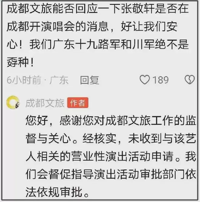 张敬轩内地演唱会传闻引抵制,多方回应难平舆论风波 最近,关于歌手张敬轩要来内地开演唱会的传闻是闹得沸沸扬扬。这不,不少网友直接涌到了成都文旅的社交媒体评论区,齐刷刷地留言表示抵制。面对这突如其来的舆论压力,成都文旅方面紧急出面回复,明确否认了张敬轩成都演唱会已过审的消息。与此同时,公开支持张敬轩在内