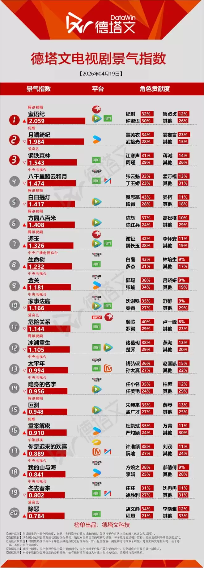 德塔文电视剧景气日报 2026-04-19 电视剧当日景气TOP20 TOP20排名 蜜语纪(纪封32% 许蜜语30%) 月鳞绮纪(露芜衣34% 武拾光28%) 钢铁森林(江寒声31% 周瑾29%) 八千里路云和月 白日提灯 方圆八百米 逐玉 生命树 金关 家事法庭 危险关系 冰湖重生 太平年 隐身