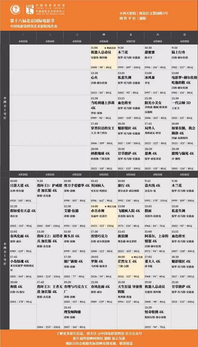 需要提醒各位的是,北影节所有场次均在猫眼平激进分子家售票。而电影资料馆日常的学术放映,则可以通过淘票票或中国电影资料馆官方APP购买。具体的排片详情,可以参考文末的图片。祝各位观影愉快。❤️