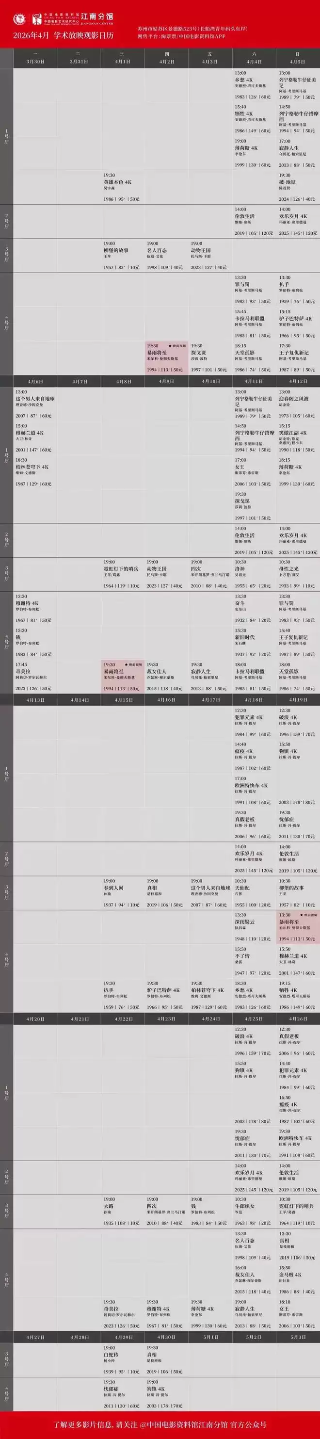 至于苏州江南分馆,今日没有安排放映。大家可以关注一下,他们的五月片单预计在4月27日公布,开票时间则定在29号。五一假期连放五天,值得期待。